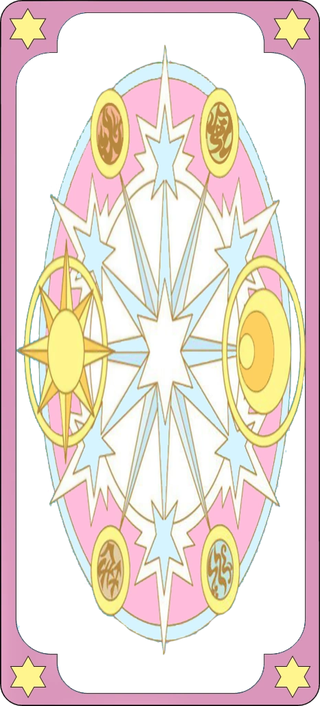 Mặt trước cũng có phần viền vàng bao quanh hình ảnh tượng trưng ở trung tâm giống như Thẻ Bài Clow, họa tiết mặt trăng và mặt trời ở phần giữa hai bên giống như Thẻ Bài Sakura. Ở trên, có một ngôi sao bảy cánh lớn với mỗi cánh là một ngôi sao năm cánh nhỏ cùng với ký hiệu tiếng Trung/tiếng Nhật của thẻ bài; bên dưới là một chiếc ruy băng có tên của thẻ bài, phía dưới ruy băng là một ngôi sao chữ thập đang đè lên một ngôi sao bốn cánh.
